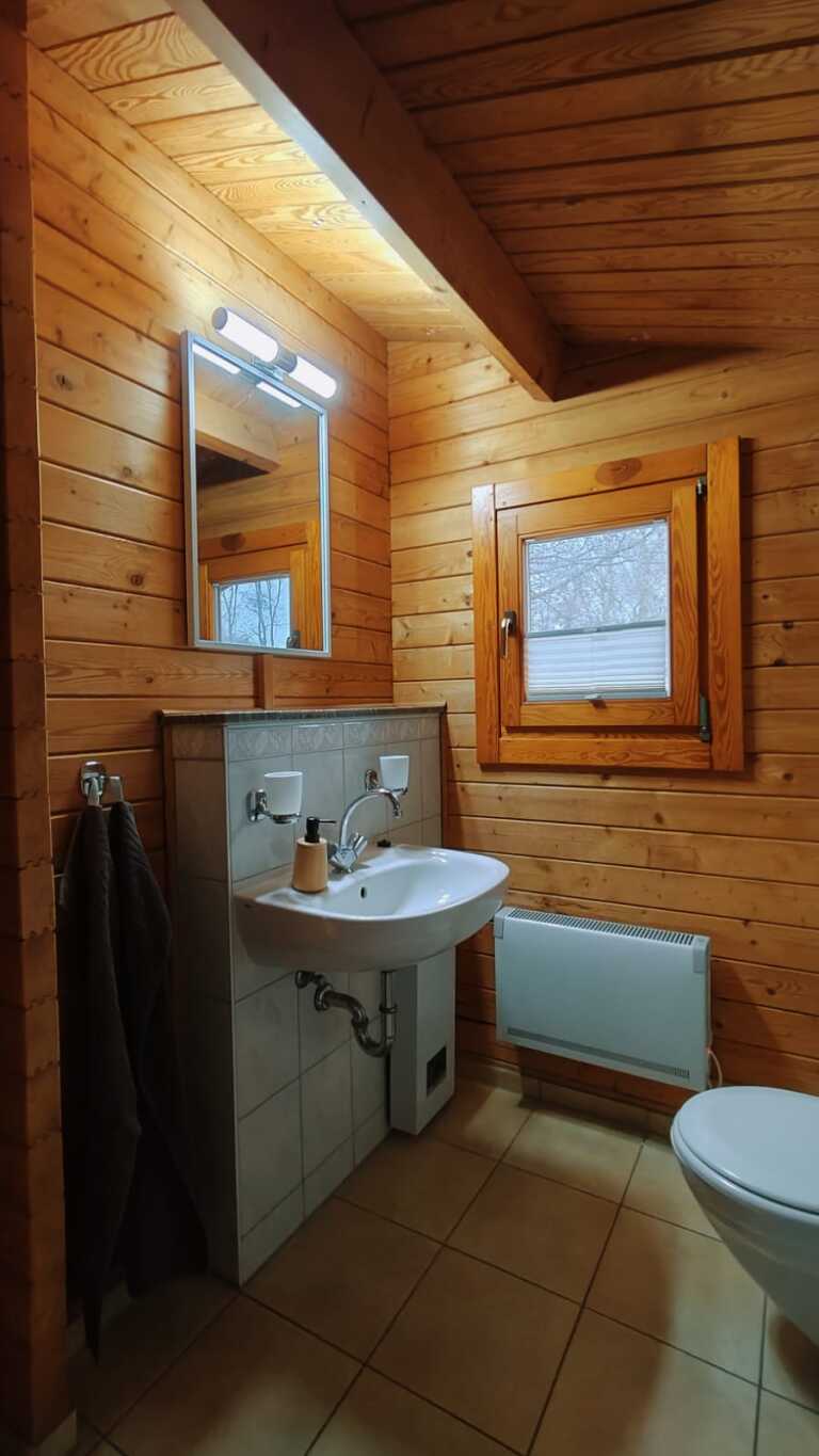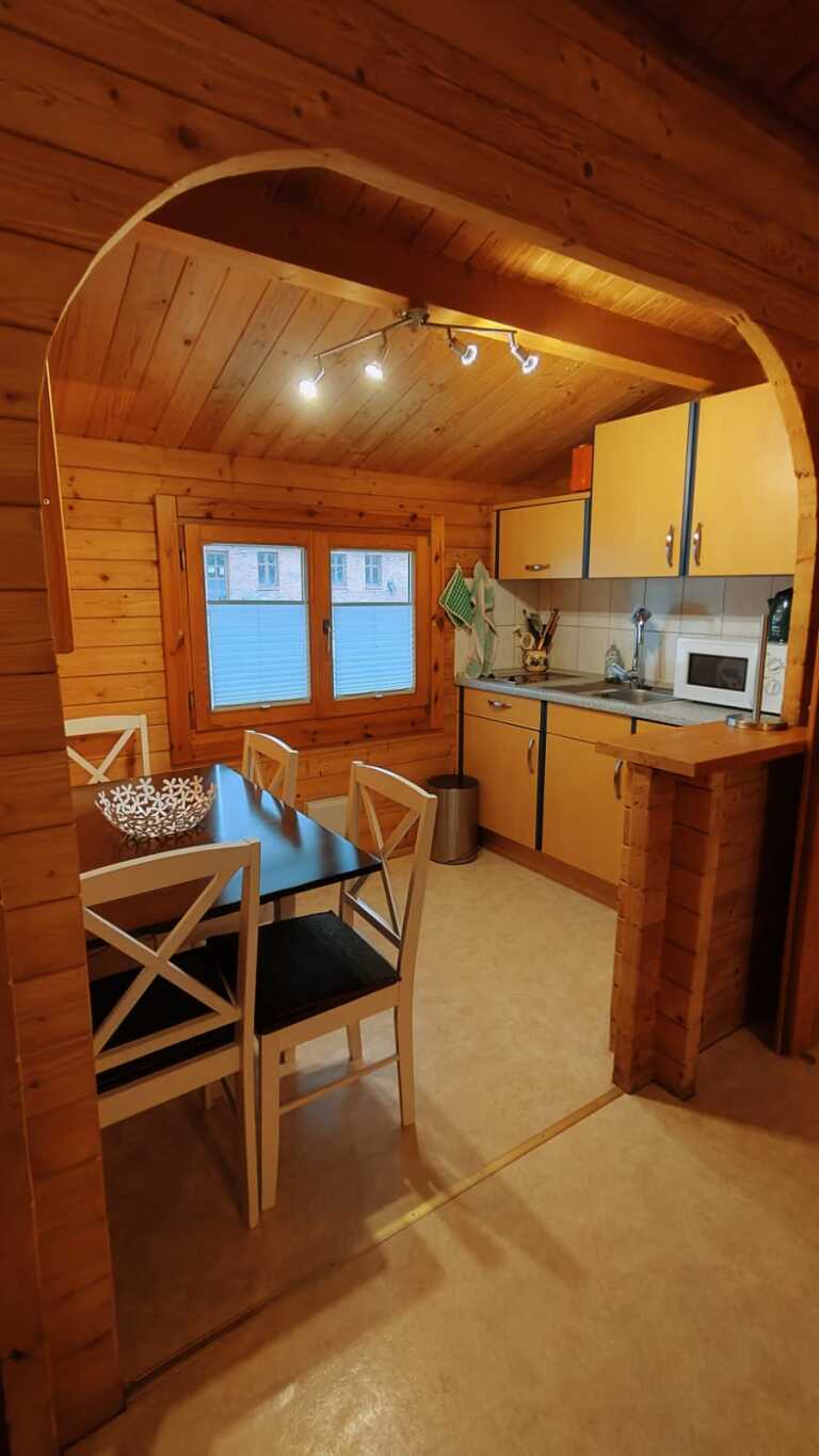 Im Inneren erwartet Sie ein gemütlicher Wohnbereich mit rustikalem Charme, der zum Entspannen und Verweilen einlädt. Große Fenster sorgen für viel Tageslicht und ermöglichen auch von innen aus einen schönen Blick in die Natur. Die gut ausgestattete Unterkunft bietet ausreichend Platz für Paare, Familien oder kleine Gruppen.